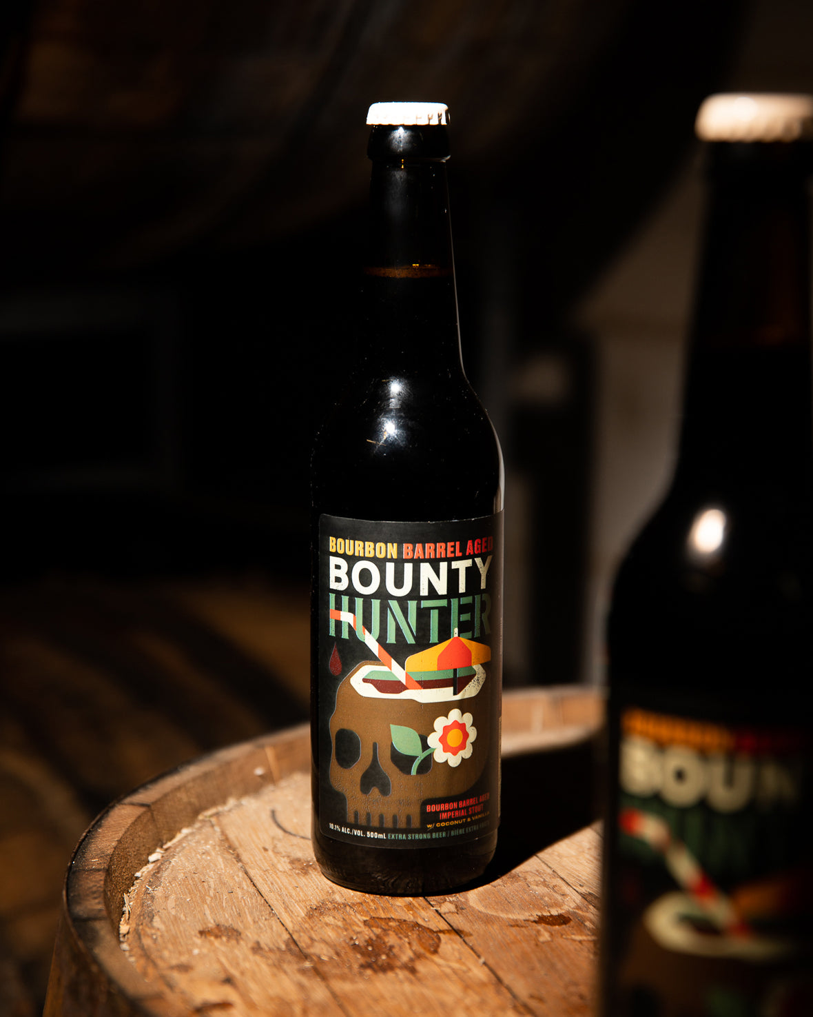 Bounty Hunter is our Imperial Stout that we condition on loads of toasted coconut and vanilla bean -- featuring notes of bitter chocolate, rich dark malts, and a subtle underbelly of tropical notes.