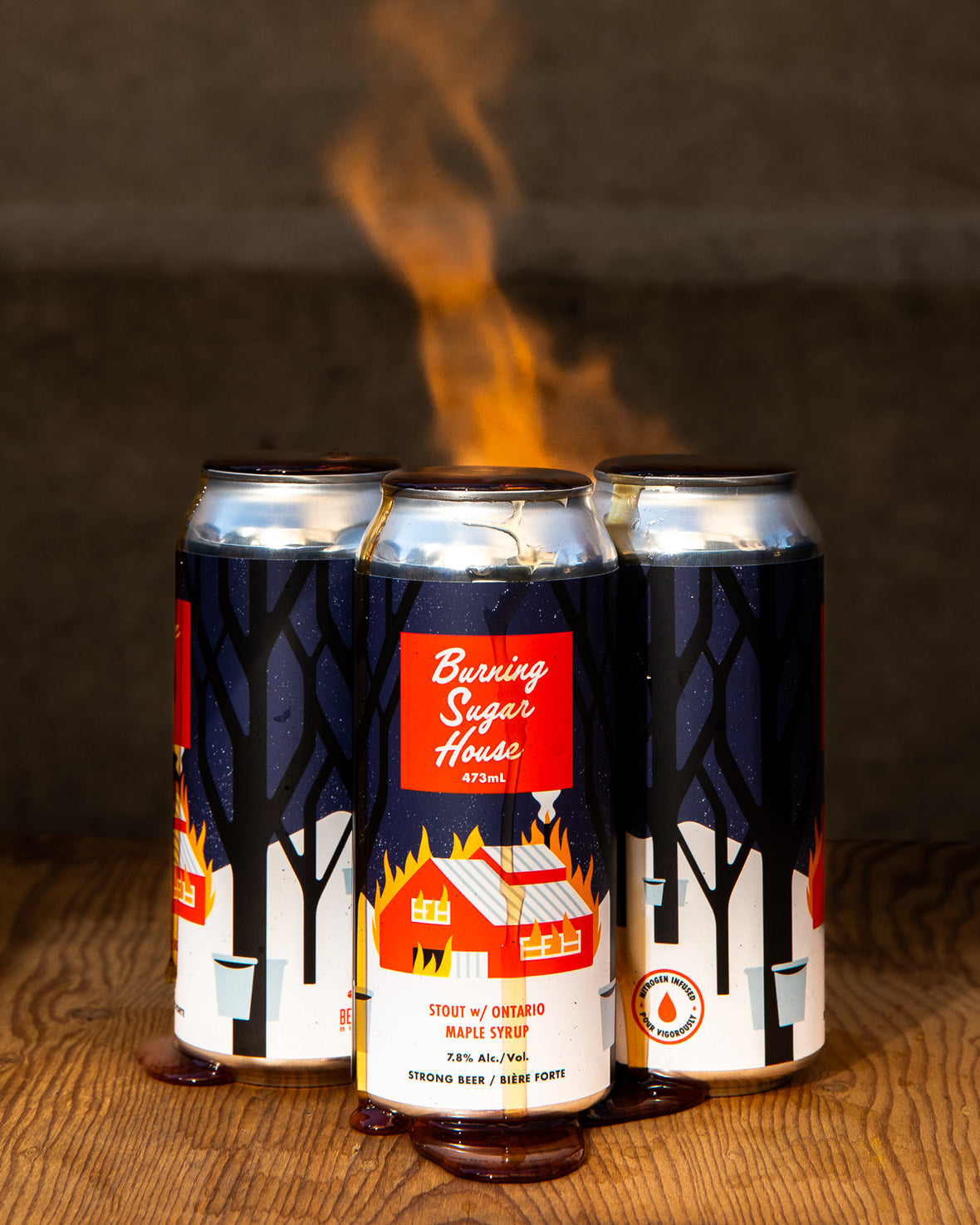 This beer has had a few iterations over the years, starting as an IPA called Sugar House in 2017, and then a DIPA called Sugar Sugar House House in 2024. To take it up a notch, we decided to set fire to our idea of what this beer could be, and go all in on the Canadiana theme with Burning Sugar House.