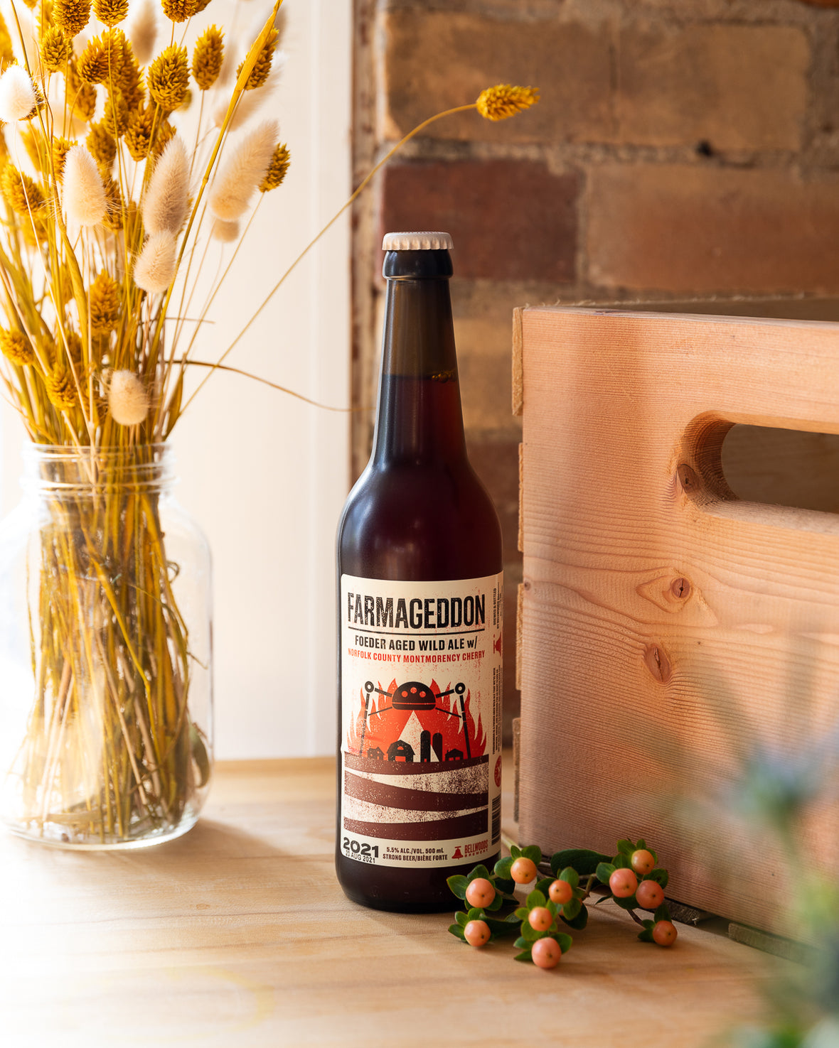 Farmageddon is our wild farmhouse ale that we've been brewing, blending, and aging for almost as many years as we've been open. The blending process allows us to maintain a common thread across batches, the aging adds nuanced layers, while the brett and bacteria work hard to create small idiosyncrasies in each release.  It's a refined, effervescent, and delicious beer worthy of special occasions and idle weeknights.