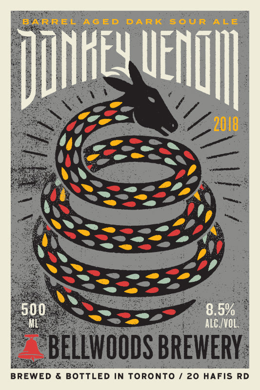 One of the first aged sours to leave oak at Bellwoods, Donkey Venom is a complex beer that we've brewed and blended many times over the years -- constantly subject to our relentless process of refinement. At its roots it's a rich, dark ale, but the time it spends in barrels with brett and bacteria harmonizes the ingredients, yielding bright levels of acidity and complimentary fruit flavours. A hybrid style of sorts, that defies simple categorization.