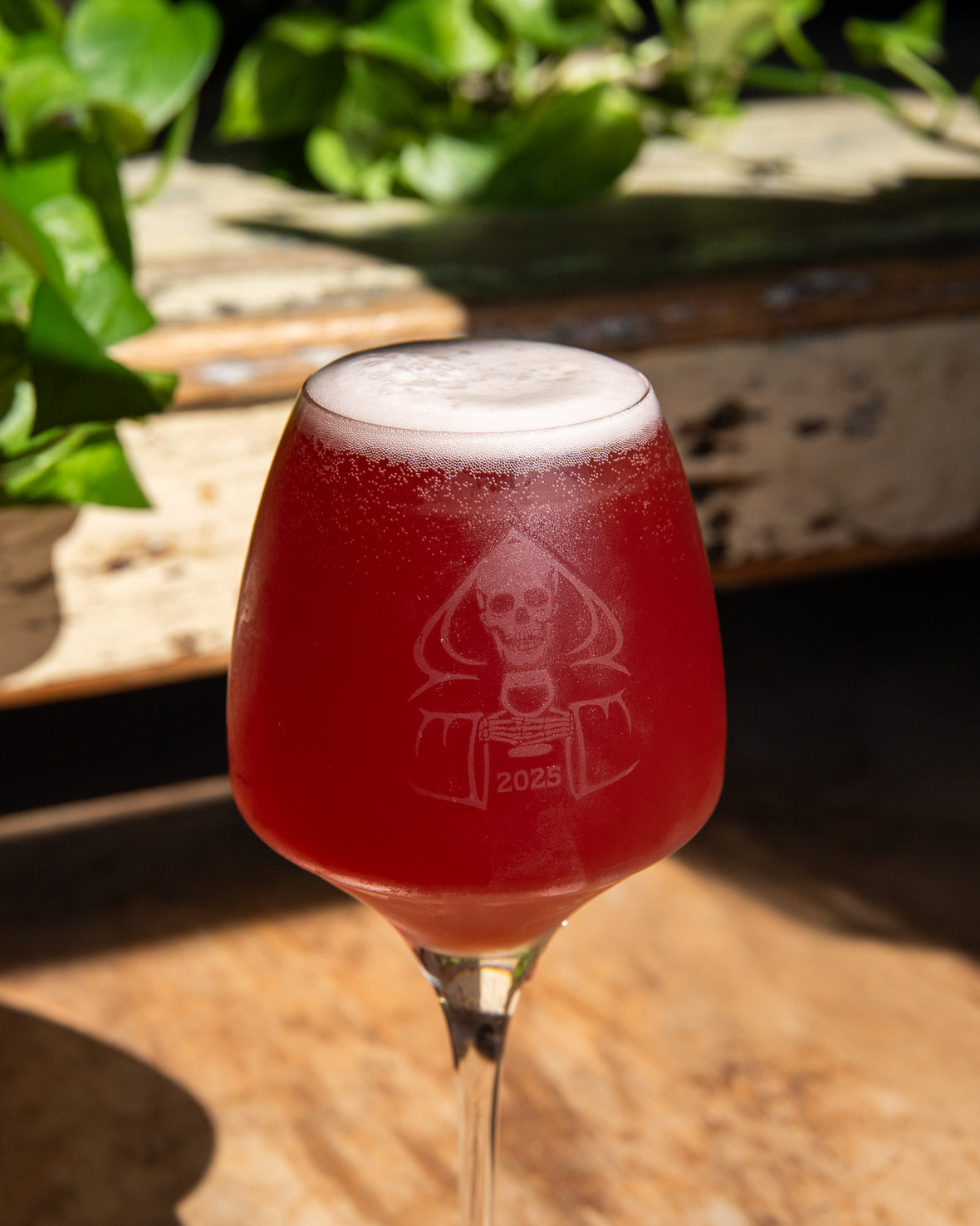 Our 2025 edition features a blend of spontaneous wild ales conditioned on Gamay grapes and purple plums. It smells like dark cherries and earthy moss, tastes like tart stone fruit, goose berry and cassis, and drinks like a spritzy, dry natural wine with oaky tannic vibes.