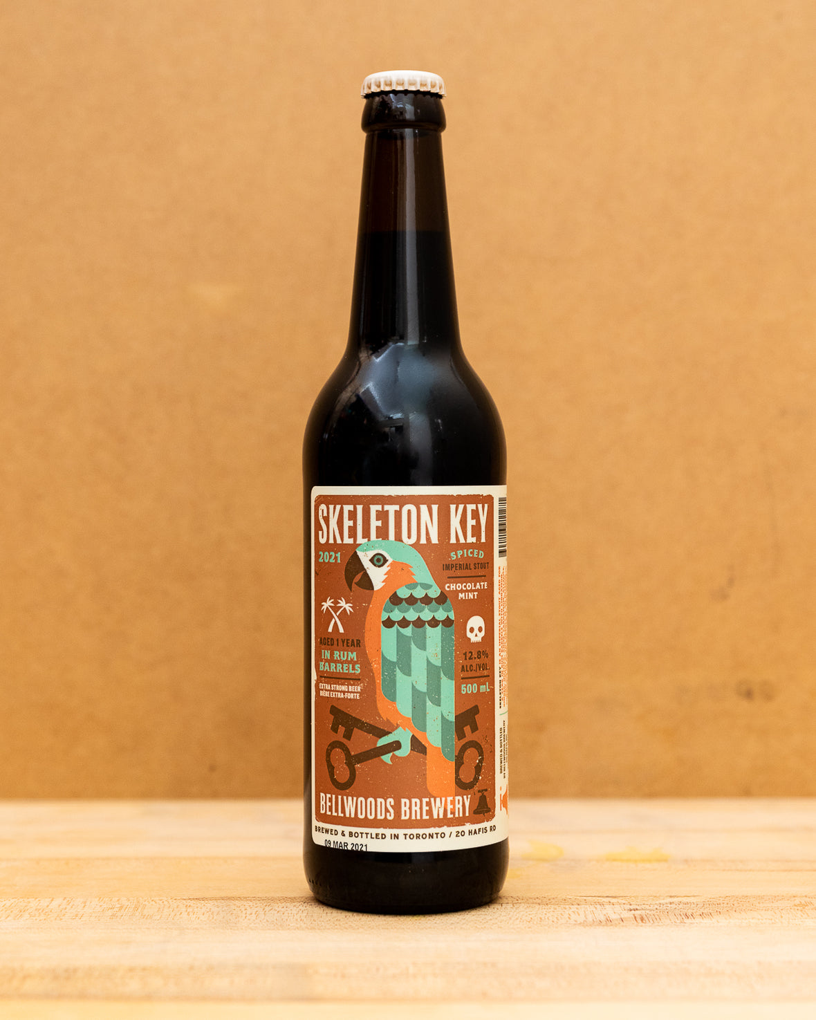Skeleton Key is an imperial stout aged for just over a year in rum barrels, with a mix of cinnamon, ginger, nutmeg, anise, cardamom, all spice, and vanilla. The resulting beer is an intense showcase of dark chocolate, caramelized malts, spirit barrel, and lively spices. This 2021 variant has been conditioned with mint and chocolate.