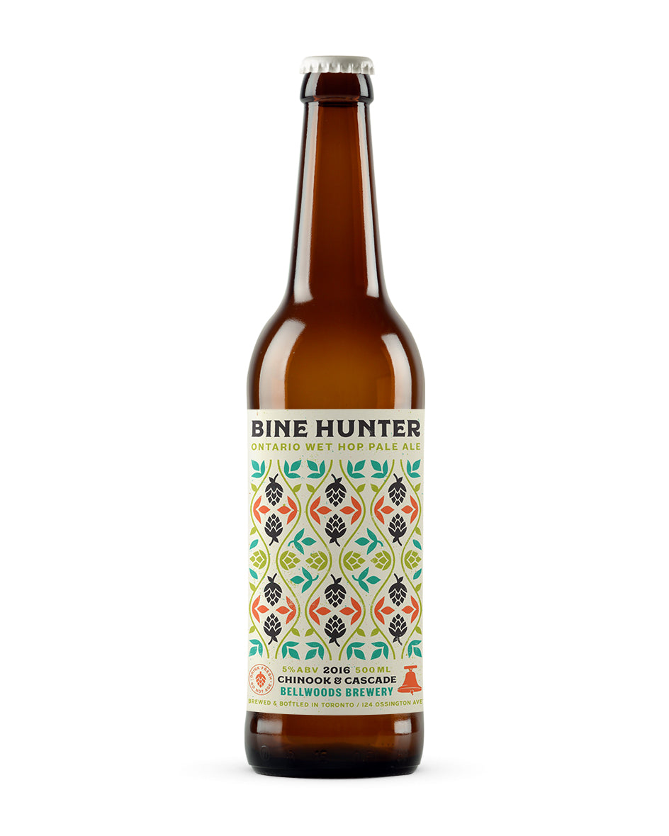 Wet hop pale ales are made using whole cone, fresh hops straight from the bine, instead of the more common dried and pelletized form. The style is a rare seasonal treat, possible only during the hop harvest which occurs just once a year in each hemisphere. Bine Hunter 2016 utilizes Cascade and Chinook hop flowers from Bighead Farm in Meaford Ontario, and deserves to be consumed AFAP (as fresh as possible!).